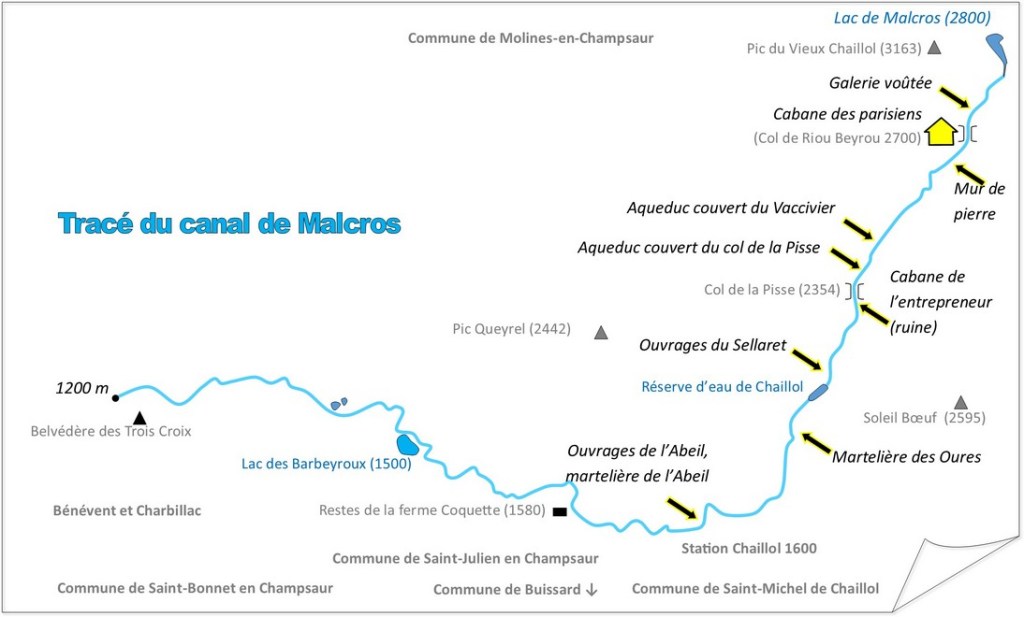 Folle entreprise que d’avoir voulu capter l’eau à 2800 m d’altitude, au pied du glacier de Malcros, pour la conduire, de col en col, jusqu’aux cultures de la vallée. Certes l’entreprise est folle, mais elle est belle, parce qu’elle est osée et tellement essentielle à la forte population du Champsaur au XIXème siècle.