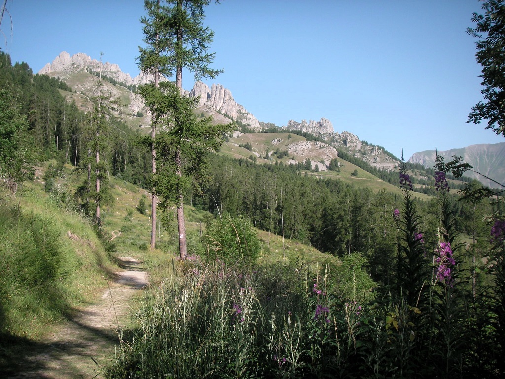 Quitter le sentier et choisir un passage entre rochers et alpages (viser un groupe de petit mélèzes) pour rejoindre le sentier balisé au Nord de la Serrière de la Fourche. Il rejoint une piste qui ramène à droite, vers la station.