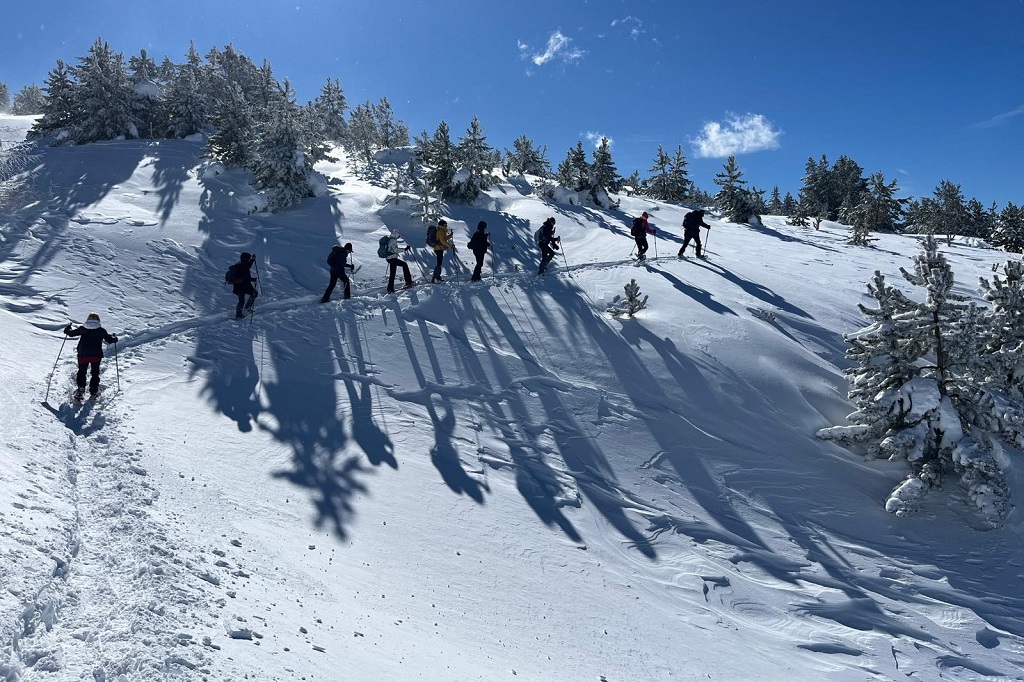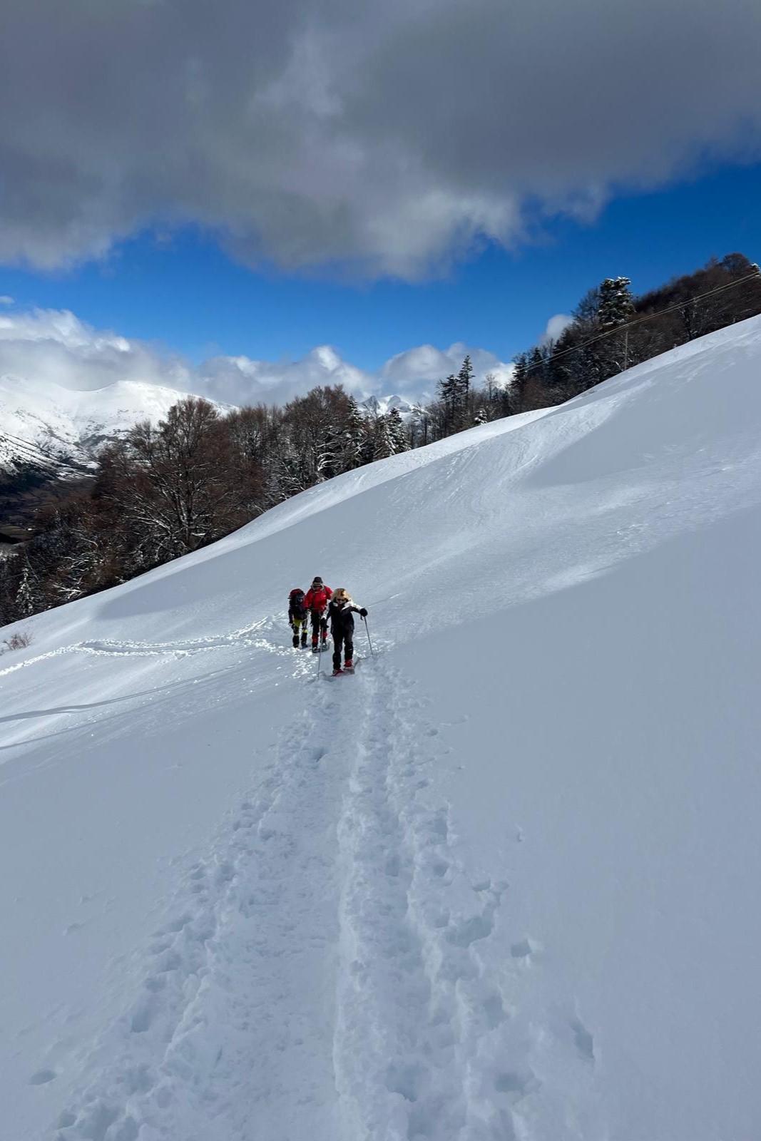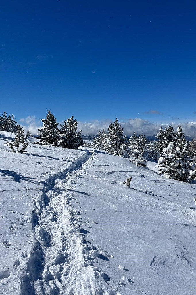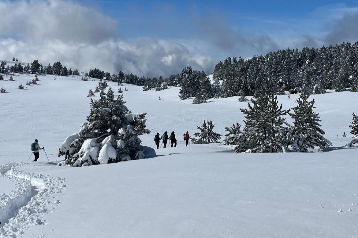 Très belle randonnée en raquettes au départ de la station par une journée bien ensoleillée et à travers des paysages enneigés magnifiques. Nous démarrons tout de suite par une petite grimpette au-dessus du parking puis par une longue remontée dans le vallon à l’est. Nous suivons les traces au milieu du vallon immaculé. L’épaisseur de neige est impressionnante. Au fur et à mesure de la montée, un petit vent frais nous saisit et de petites bourrasques soulèvent la neige au sol, dessinant de jolies vagues. Nous nous arrêtons un moment pour admirer deux personnes pratiquant le speed riding (ski et mini-voile de parapente) qui passent à proximité de nous. Nous nous dirigeons vers la zone boisée que nous traversons parmi les sapins croulant sous la neige. C’est féérique ! Nous nous arrêtons à l’abri du vent pour le pique-nique (cote 178environ). Le vent souffle par rafales dès qu’on prend un peu d’altitude mais que c’est beau ! Après un petit détour vers la Sapie pour prolonger ces bons moments, retour au parking avec plein de belles images dans la tête.