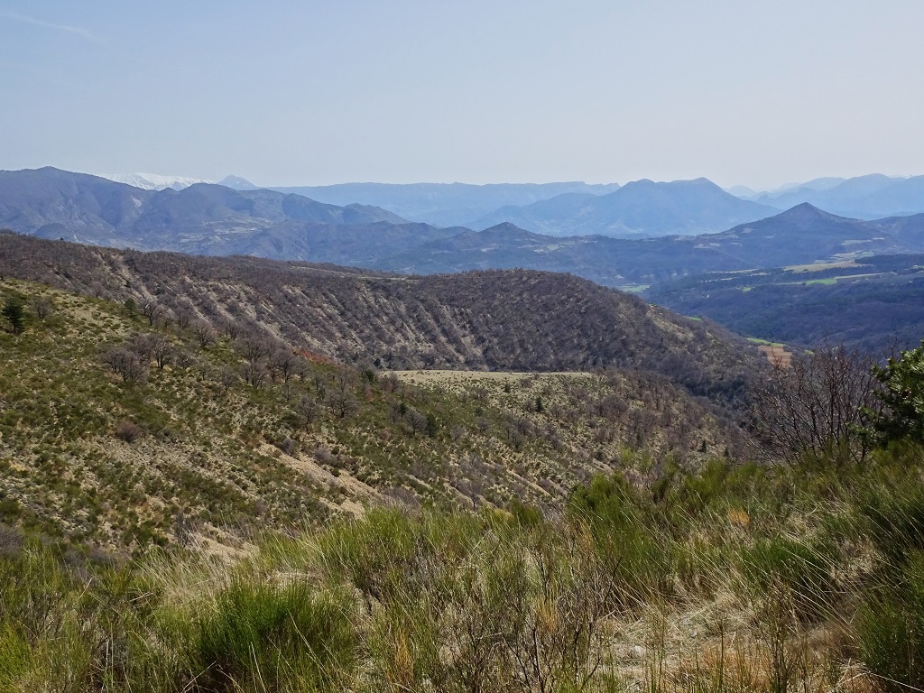 Aujourd’hui début du Printemps la journée est presque estivale et nous avons plaisir à prolonger la pose pique-nique sur la terrasse devant la chapelle. Celle-ci, construite au XVIIème siècle, est en cours de restauration. A l’extrémité du bâtiment, une pièce y est aménagée en refuge pour les randonneurs). Quelques fleurs en bordure de sentier (potentilles, hépatiques) mais les arbres ont encore leur parure hivernale. Le ciel voilé ôte aujourd’hui tout relief au panorama. Belle rando, dans un environnement varié, mais en terrain composé de galets qui roulent sous les pieds.