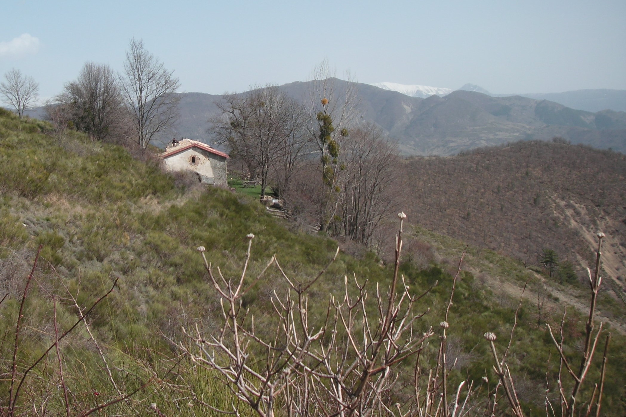Au col St Joseph la vue se dégage. On continue en direction de la chapelle, au milieu des genêts. On n’aperçoit l’ensemble formé par la chapelle, l’ermitage et le refuge qu’à une courte distance.