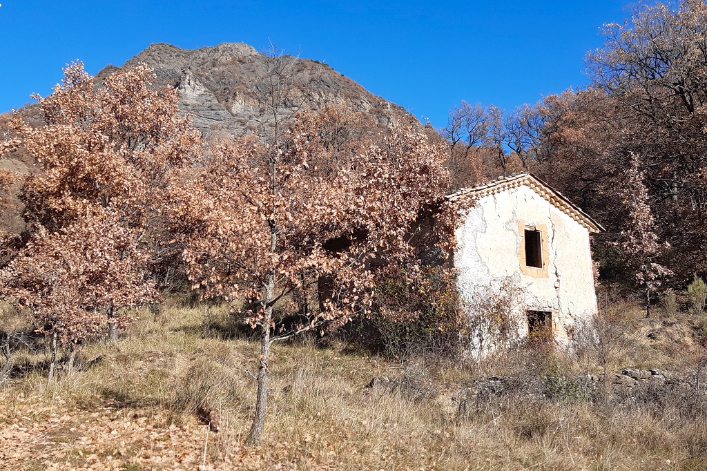 Après la traversée du torrent, prendre à droite et descendre en bordure de prairie, passer près d’un cabanon et continuer à descendre tout droit pour trouver un chemin qui part à gauche et rejoint le site de l’oratoire.