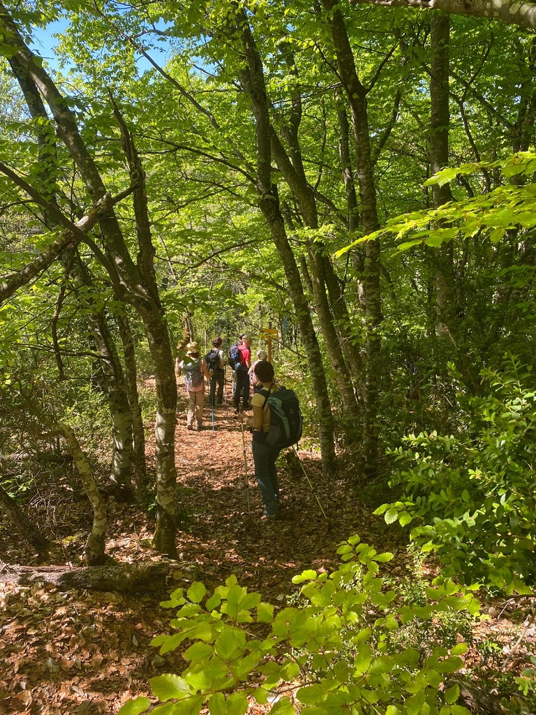 Très belle randonnée variée par une journée très ensoleillée avec l’ascension de deux beaux sommets. Nous avons atteint le col de Saint-Ange en fin de matinée puis nous avons retrouvé Marcel qui nous a fait une jolie surprise en arrivant en voiture par la route forestière de Beynaves. Nous avons déjeuné tous ensemble à la « Clairière aux papillons » (espace d’accueil avec sanitaires, coin pique-nique et point d’eau, aménagé par le Département des Hautes-Alpes et accessible notamment aux personnes à mobilité réduite). Marcel a fêté son anniversaire, dans la bonne humeur générale, en apportant boissons fraîches et charcuterie. Puis nous avons gravi tous ensemble le sommet du Rocher de Saint-Michel, admiré les sommets environnants et le village d’Orpierre avec ses falaises d’escalade. Pendant que nous redescendions sur le sentier pentu et rocailleux pour rejoindre Orpierre, Marcel, rejoint par Cristina, est retourné à la Clairière aux papillons pour reprendre sa voiture.