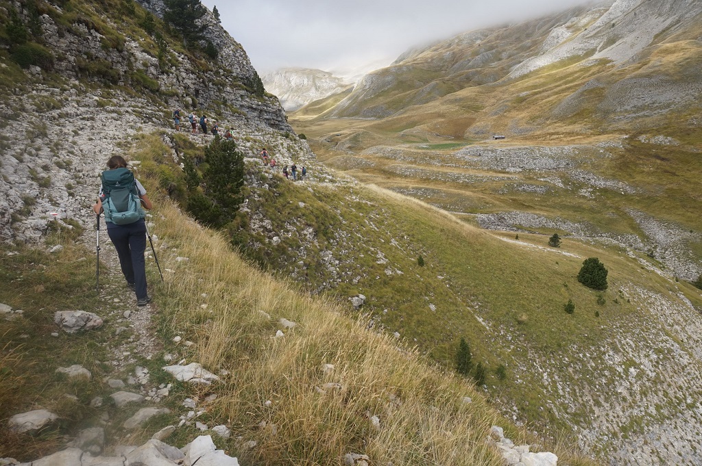 Très belle randonnée dans le magnifique vallon des Aiguilles, sans difficulté, avec juste un petit passage rocheux un peu exposé au-dessus du cirque de la cascade. Nous avons aperçu quelques chamois dans les éboulis de part et d’autre du vallon et un gros troupeau de moutons en direction du Collet. Nous avons déjeuné au col entre les sommets de l’Aiguille (le Haut Bouffet) et la Tête de Vachères. Le brouillard venant de la Drôme nous a caché entièrement la vue sur le Trièves mais il s’est arrêté au col . Nous avons pu passer par le Collet pour le retour car le troupeau n’y était plus et admirer la vue depuis le col de