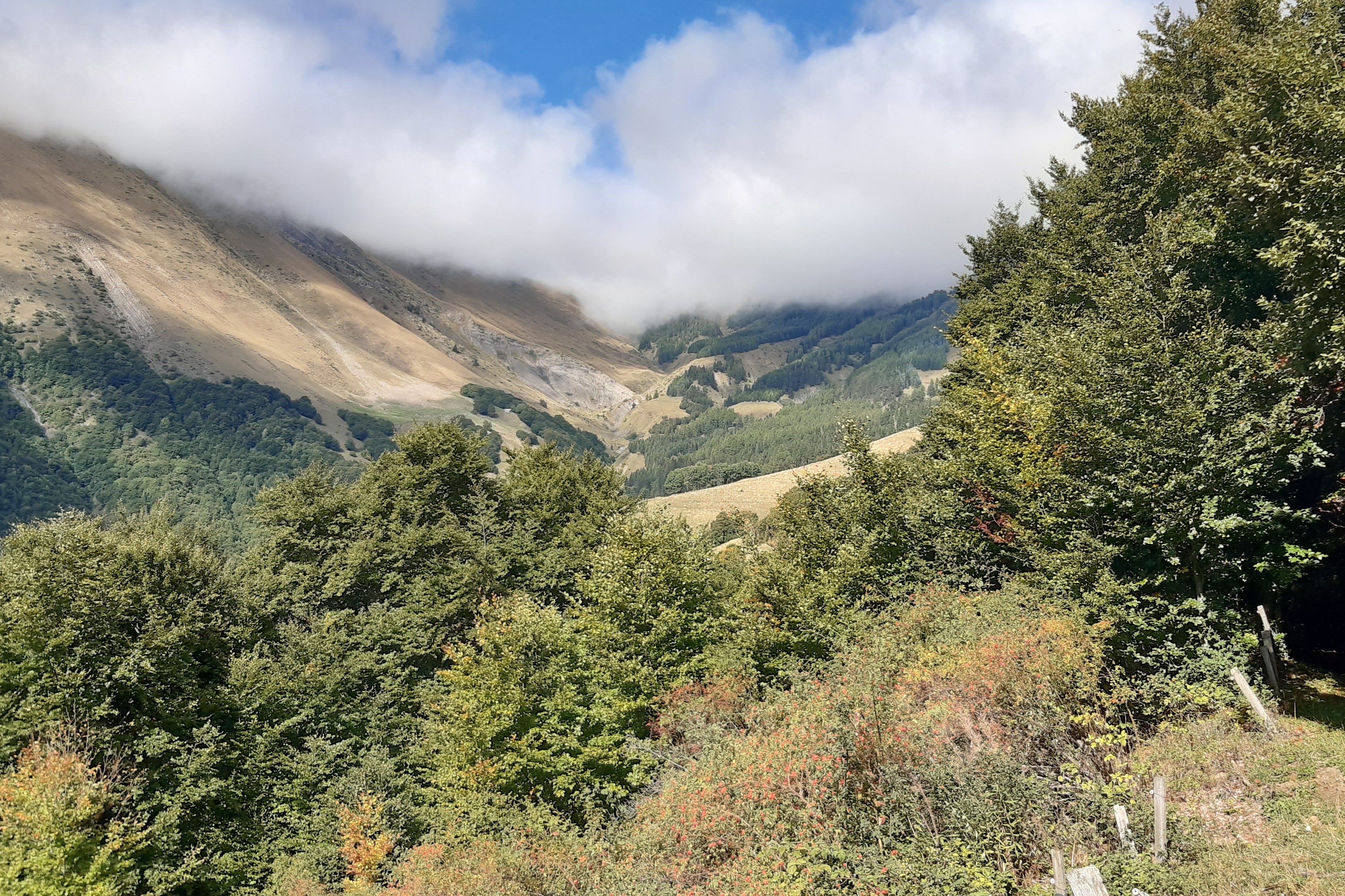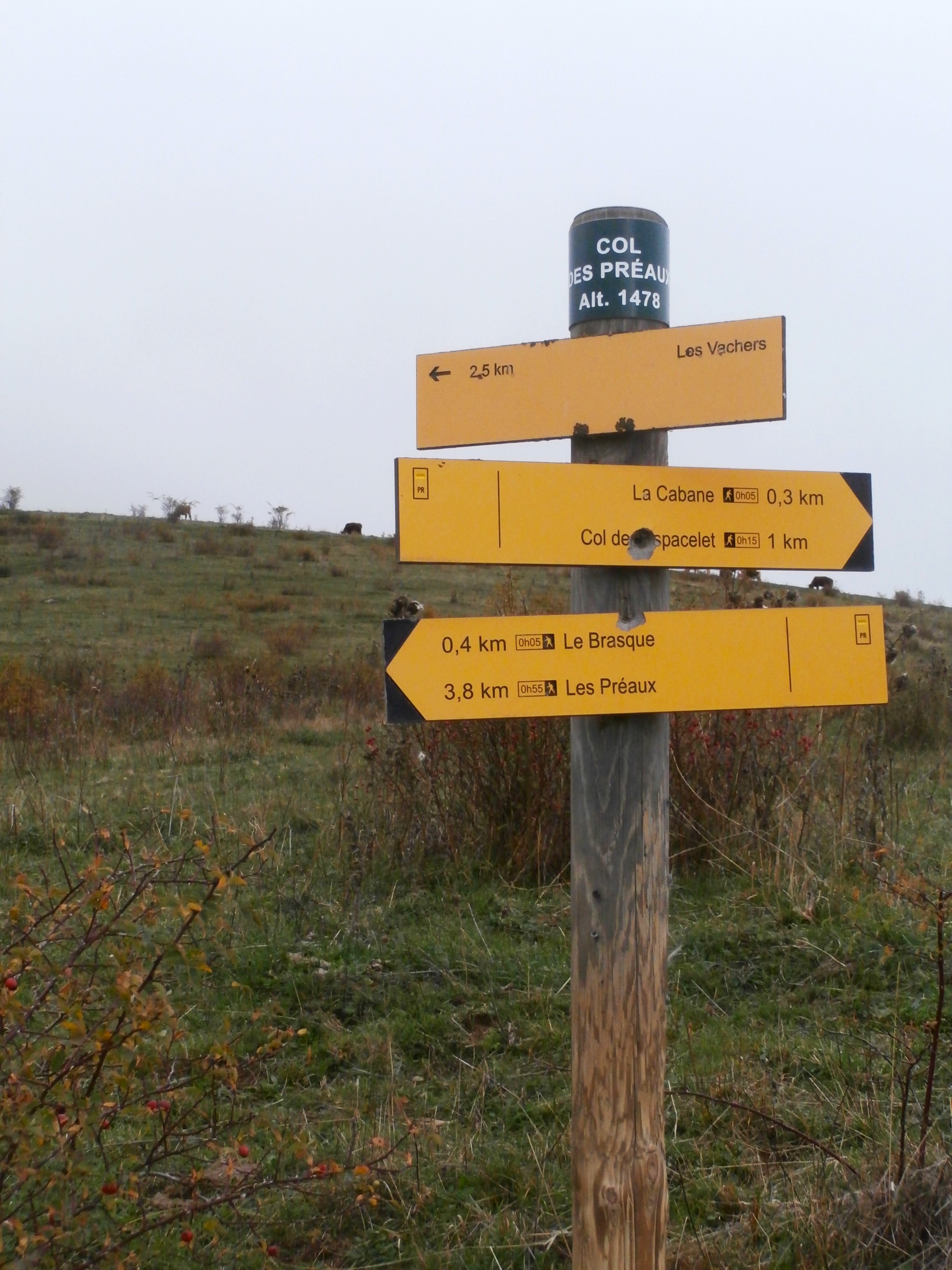 En quelques lacets il rejoint un chemin plus large qu’on prend vers la gauche. Passer une épingle serrée et poursuivre en sortant de la forêt, jusqu’au col des Préaux.