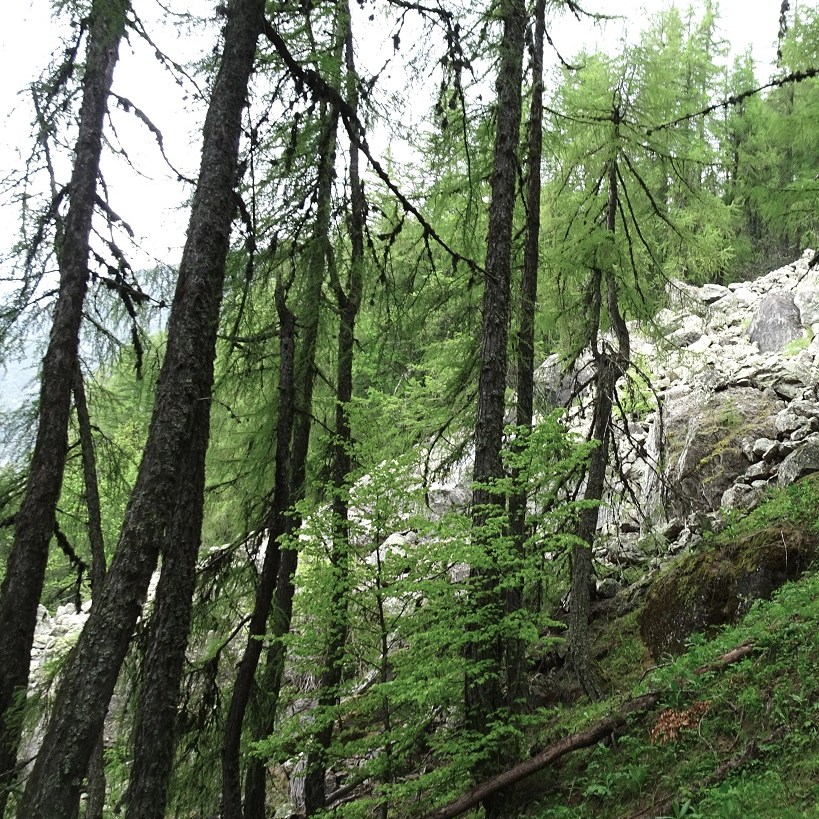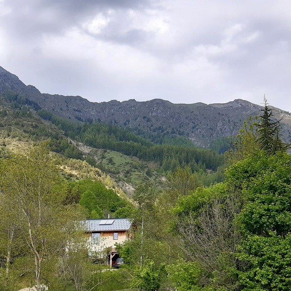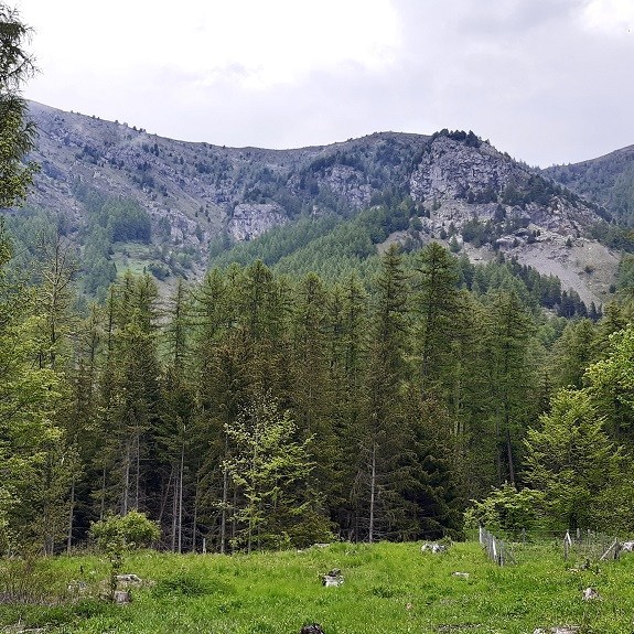 Traverser le pont et partir à droite sur une piste qui longe le torrent au milieu d’une forêt de pins et de mélèzes pour arriver au niveau des maisons forestières de Subeyrannes.