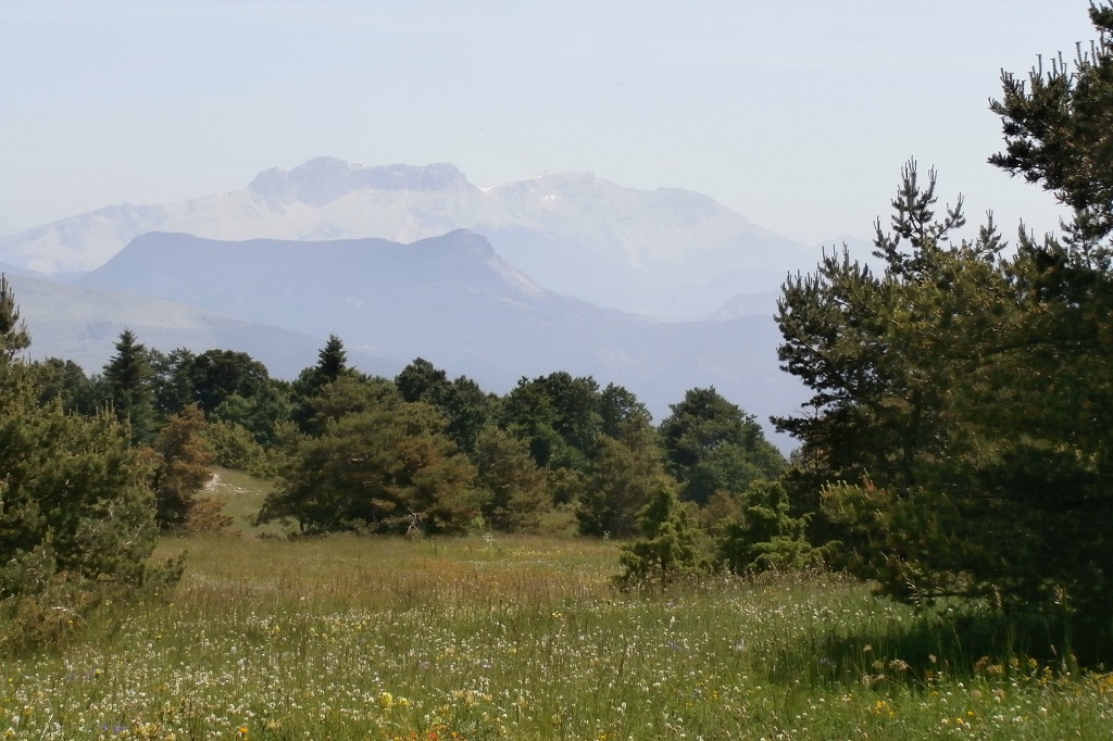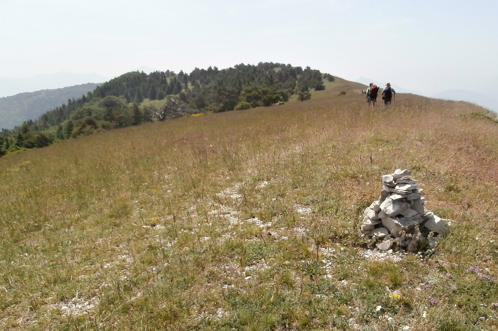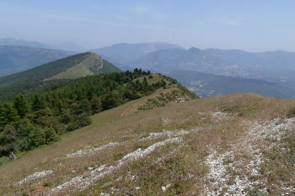 Très belle journée, bien que le ciel soit encore très brumeux. Nous avons apprécié la montée en forêt car la pente est rude et il fait déjà bien chaud au soleil. Nous avons eu la bonne surprise de trouver Marcel venant à notre rencontre sur la crête ! Nous avons pu suivre les évolutions d’un parapentiste et de vautours fauves, sans compter les planeurs qui nous ont survolés de près, le long de la crête.