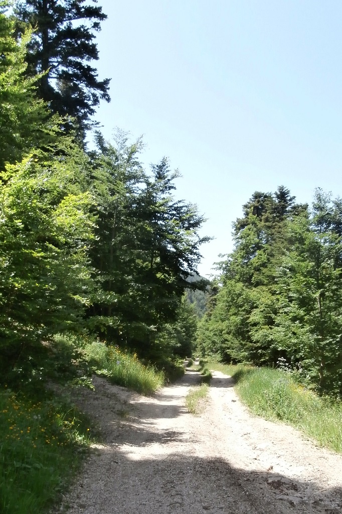 Au col prendre à droite, un sentier qui pénètre en sous-bois et quelques mètres plus loin, encore à droite, le sentier qui monte. La pente est soutenue, en forêt sur une croupe puis en bord de ravin jusqu’aux rochers qui annoncent la crête.