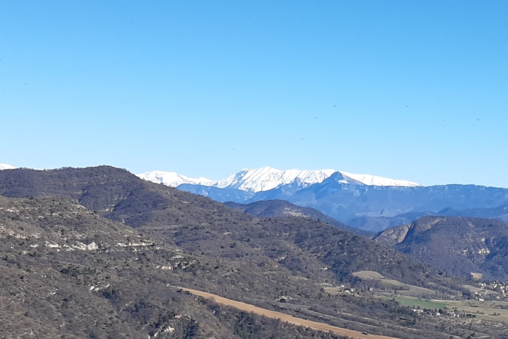 Très belle journée ensoleillée, bien appréciée après deux sorties annulées à cause de la pluie. Aucune difficulté pour cette randonnée au-dessus de la commune de Malijai. Après avoir longé quelques champs de lavande et une belle oliveraie, le parcours se déroule sur une piste en fond de ravin puis s’élève sur son flanc boisé. Nous avons aperçu quelques bulbocodes et crocus, premiers signes du printemps. Arrivée en crête, nous avons admiré la vue dégagée sur la vallée de la Durance, le barrage de l’Escale et Château-Arnoux, et le pays Dignois, notamment le Cousson. Nous avons fait une longue pause au sommet, profitant du soleil et de la vue sur les sommets enneigés du Cheval-Blanc.