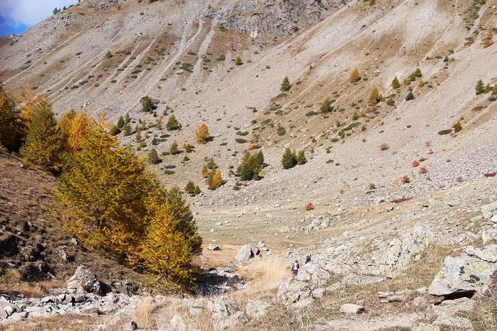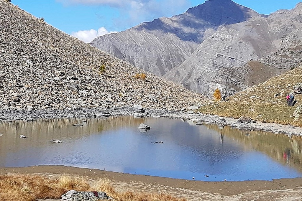 Nous étions 20 au départ de cette belle randonnée dans l’embrunais à destination de ce petit lac niché à 2238 m d’altitude. La journée était bien ensoleillée toute la matinée et la température très agréable pour la saison. Marcel, Cristina et Danièle T. se sont arrêtés pour le déjeuner à proximité de la cabane du Crachet, face à la montagne Pellat. Dans le vallon, plus de fleurs ni de sifflements de marmottes mais un émerveillement de voir les mélèzes revêtir leur parure d’automne. Le reste du groupe est remonté de 130 m environ pour s’arrêter pique-niquer juste au-dessus du lac du Crachet dans le cirque entre le col du Crachet et le col de Lalatcha avec la vue sur l’Eyssina et le Pic de Crévoux. Marie-No a partagé son délicieux cake à la butternut. Au retour, nous avons pris de temps d’admirer la cascade du Crachet en aval du lac puis le groupe s’est reformé dans la descente vers la Chalp avec la traditionnelle « photo de famille ».