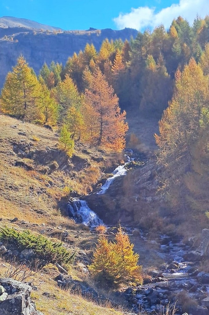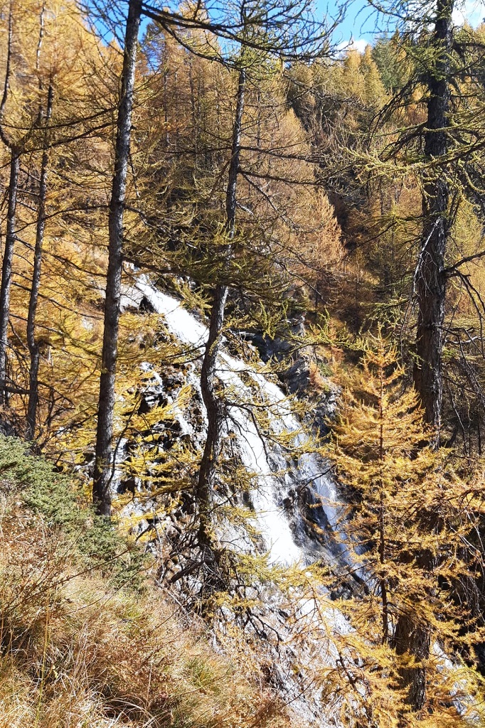 Le chemin monte d’abord en bordure de prés puis devient plus raide, traverse le torrent, continue en lacets dans la forêt (repérer la trace qui permet de s’approcher de la cascade) et débouche dans un large vallon.