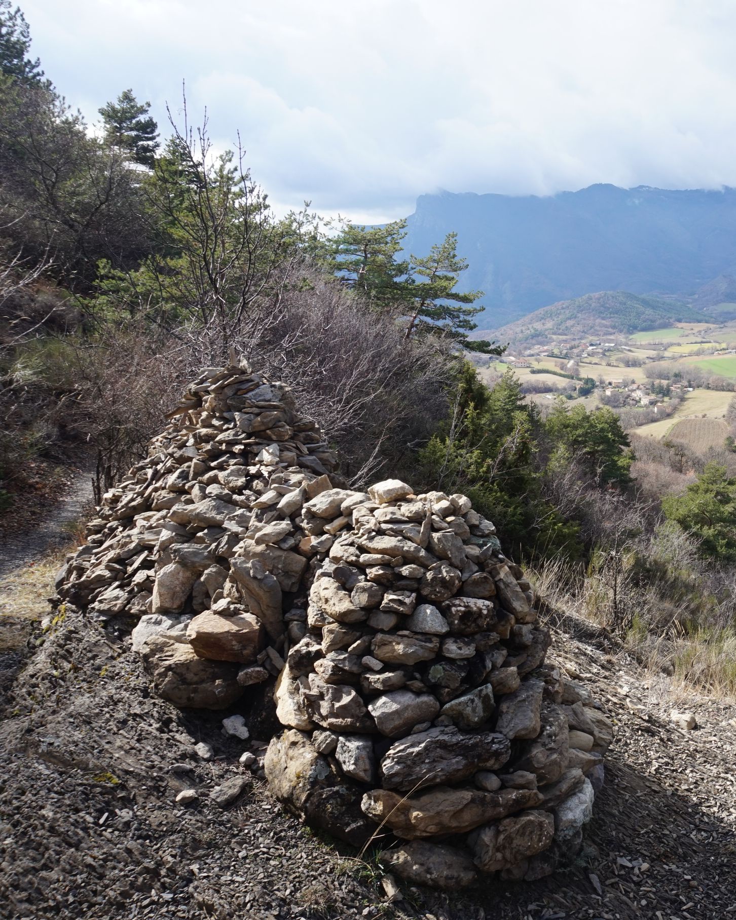 Redescendre par le même chemin et, après les lacets, prendre à gauche (cairn) un sentier qui descend vers le sud-ouest et passe près des ruines de Vières (emplacement du village d’origine).