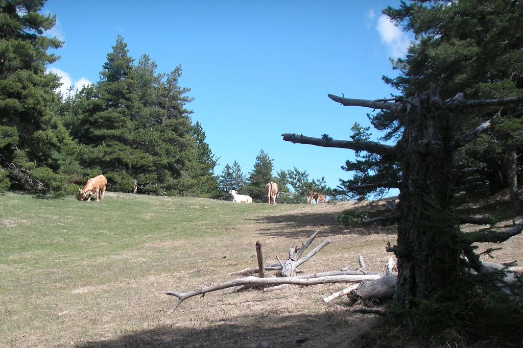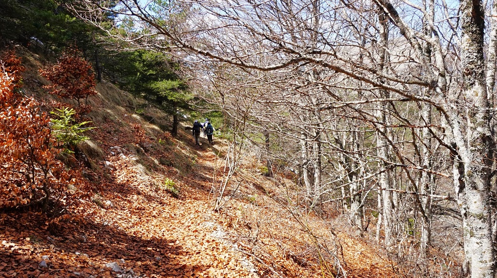 Prendre à droite une trace peu marquée qui part ensuite entre les arbres pour monter en face nord vers la crête qu’on atteint à Champlat.