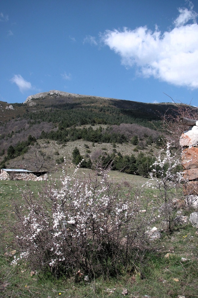 Atteindre un collet sous le sommet : on le contourne par la gauche pour arriver à un carrefour de chemins près d’une ruine.