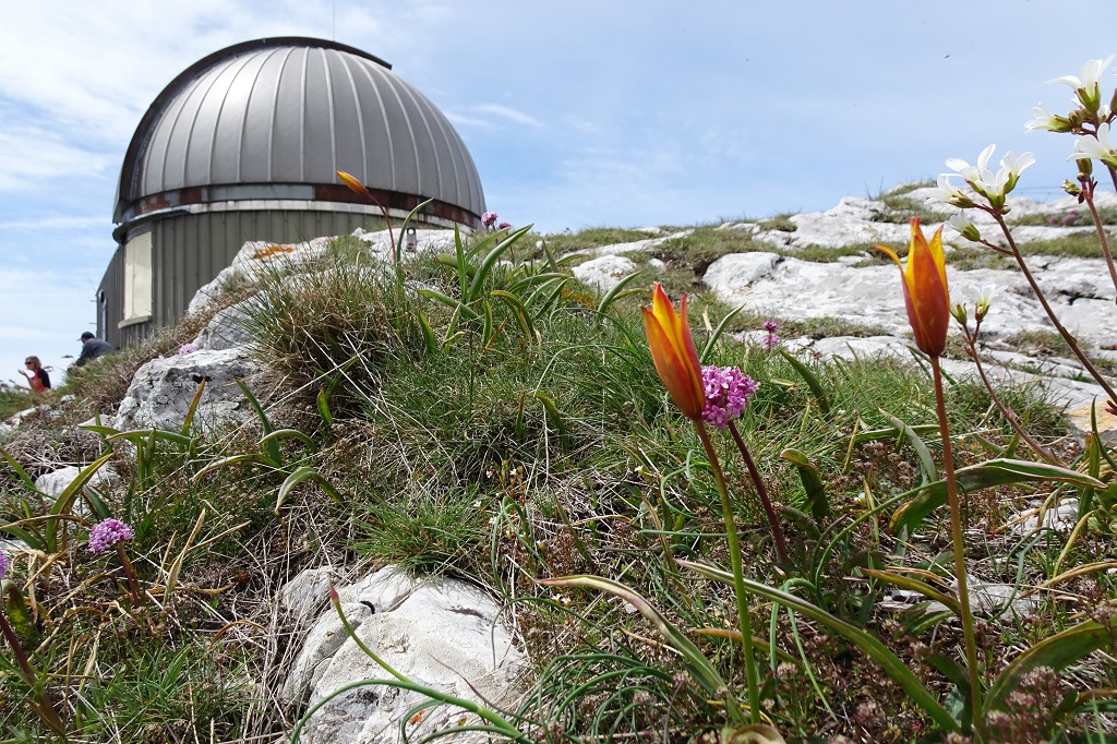Très belle randonnée assez difficile du fait de la distance et de l’important dénivelé mais avec de superbes paysages et au sommet une vue magnifique à 360°. Nous avons choisi de faire le trajet en car depuis La Saulce jusqu’à Blieux. La route d’accès au village de Blieux est très étroite et pas prévue pour le passage d’un car de tourisme. Notre chauffeur nous a malgré tout emmenés jusqu’à environ 500m du village. Nous avons donc continué le trajet à pied (2.5 km) en traversant le village, puis jusqu’au lieu-dit « Le Bas Chaudoul ». A partir de là, nous avons commencé l’ascension, toujours soutenue, sur un petit sentier surplombant un moment le ravin de la Clue au milieu de buis, de genêts en fleurs, et de thym. Nous étions entourés de beaux sommets, le Grand Mourre (1898 m) et le Petit Mourre (1874 m) et le plus haut, le Mourre de Chanier (1930 m). Quelques chamois se sont laissés admirés en broutant tranquillement. Les bords du chemin et les pâturages, étaient ponctués d’une multitude de fleurs (valérianes tubéreuses, fritillaires à involucre, tulipes australes, gentianes, hélianthèmes, céphalanthères et orchis divers). Nous avons déjeuné au sommet, à côté de la table d’orientation, au pied de la coupole de l’observatoire : gâteaux de Cristina et de Chantal, fraises de Christelle et les fameuses amandes caramélisées de Régine en dessert. De retour au car, Rolande a fêté son anniversaire avec un délicieux cake aux citrons confis et boissons diverses bien fraîches. Nous avons aussi bien apprécié le clafoutis aux cerises de Marie-No. Ambiance festive et joyeuse avant le retour en car dans lequel quelques uns se sont un peu assoupis.