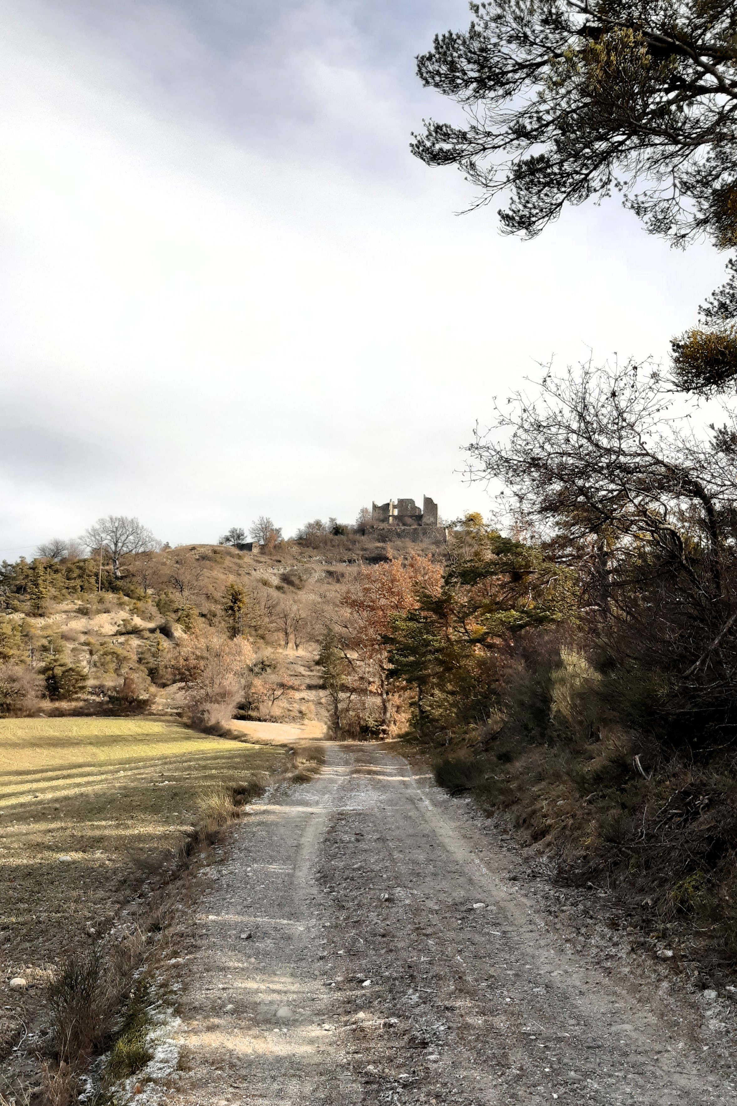 Contourner l’église et prendre à droite, la piste qui passe sous le village et les ruines du château.