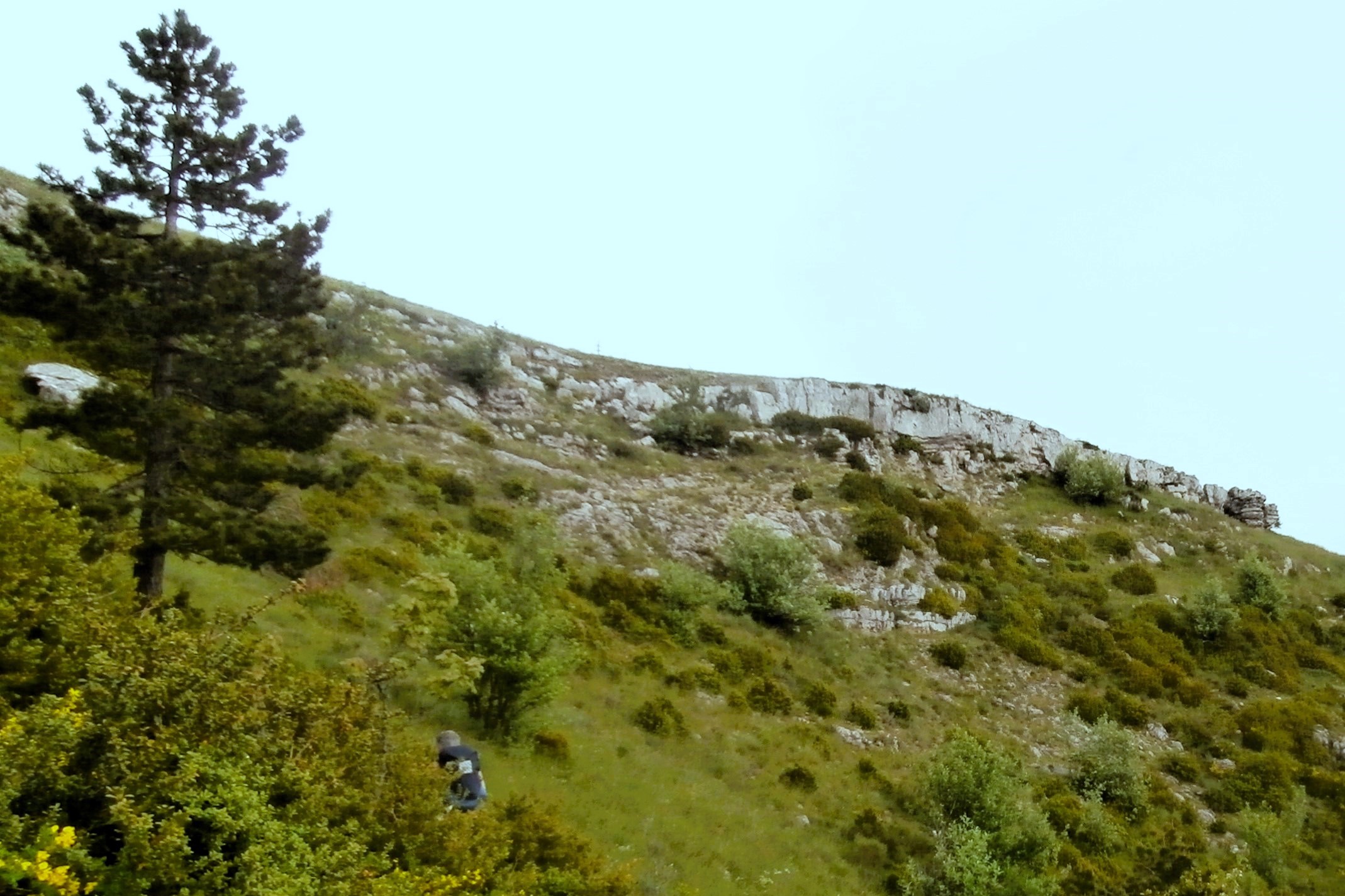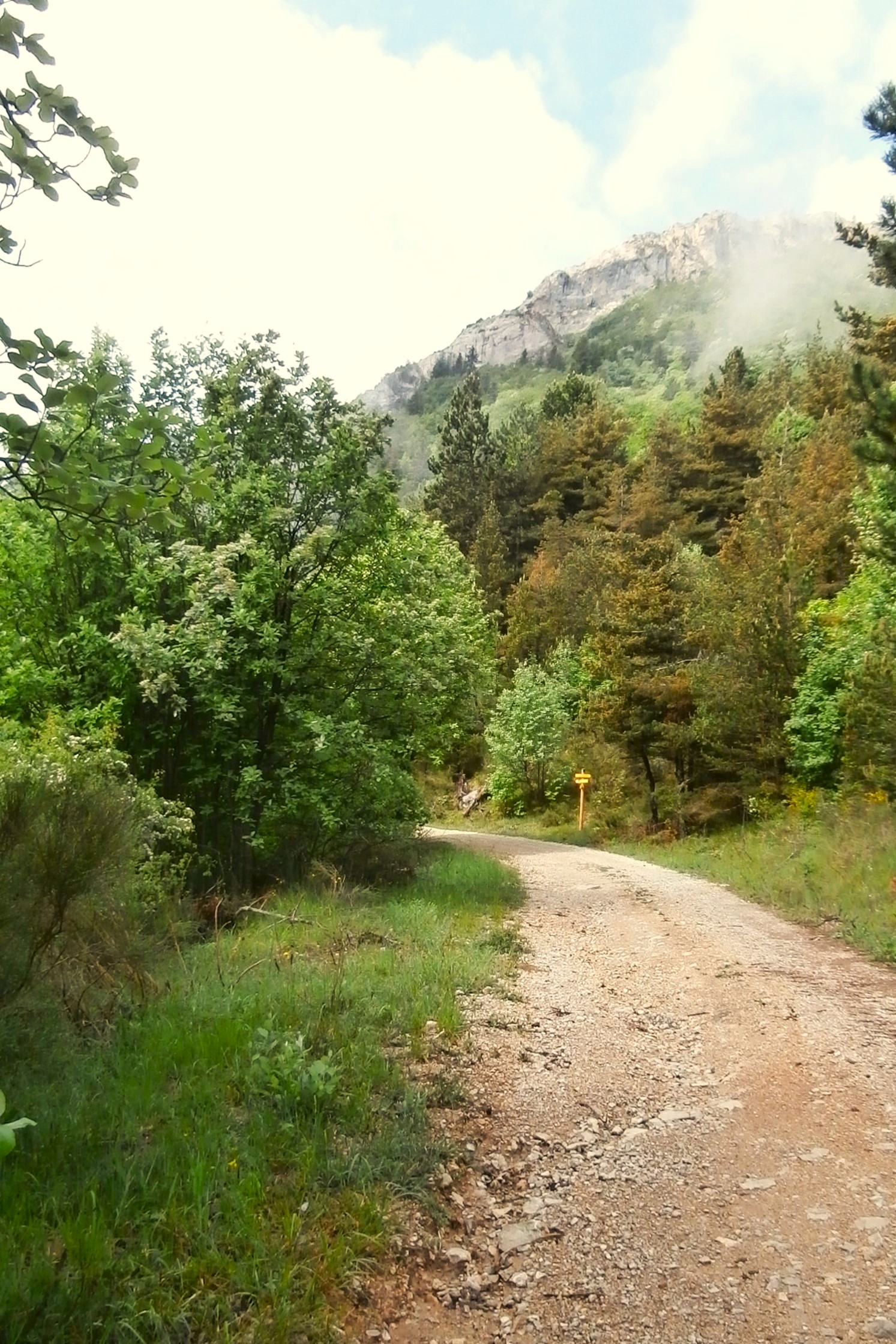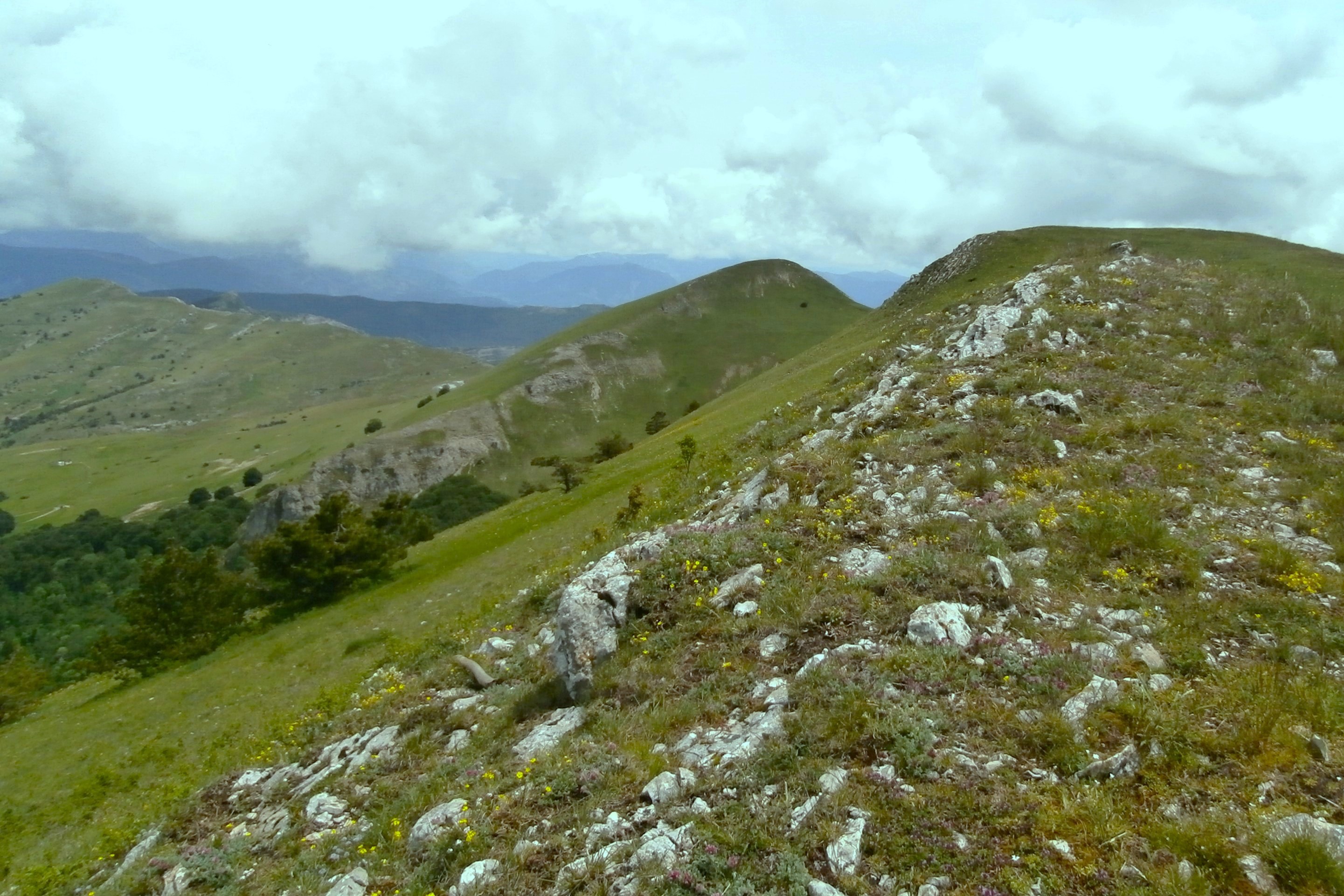 Partir en suivant la crête jusqu’à une croix, passer une zone rocheuse et descendre en lacets dans la prairie, puis les genêts, jusqu’au sentier qui passe à flanc (GR 94 tour de Baronnies provençales); le prendre vers la gauche.