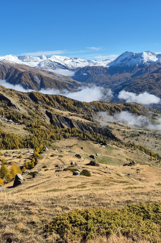 Superbe randonnée par un temps magnifique. Après avoir passé la barre de brouillard dans la vallée, c’est sous un ciel sans nuage et par une température très douce pour la saison que nous avons commencé cette belle ascension. En franchissant le petit ruisseau, bien gonflé par les fortes pluies de la veille, quelques uns d’entre nous et malgré toutes nos précautions, ont eu les pieds bien trempés (penser à ajouter une 2ème paire de chaussettes dans notre sac à dos !). Sommets enneigés, forêt de mélèzes aux couleurs d’automne ont enchanté notre parcours. Les nappes de brouillard se sont lentement dissipées laissant apparaître tous les sommets alentours. Irène et Marcel se sont arrêtés sur un petit replat, au-dessus de la cabane de la Baume. Le reste du groupe a continué jusqu’au col où nous avons pic-niqué face au sommet de Soleil Bœuf, du pic de Clot l’Amiande et de la pointe de la Prouveyrat. A l’approche du col nous avons rencontré quelques plaques de neige ainsi que sur le versant nord du Palastre. Après le déjeuner, six d’entre nous ont rejoint le sommet pour profiter d’une vue à 360°. Nous nous sommes tous retrouvés sur le parcours pour redescendre ensemble au parking.