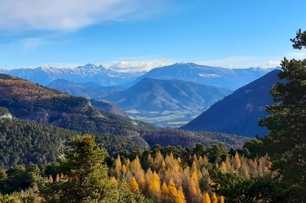 Au Col du Buissonnet (1380 m), ignorer la direction Faucon du Caire et prendre à gauche le sentier qui monte en forêt pour atteindre la crête.