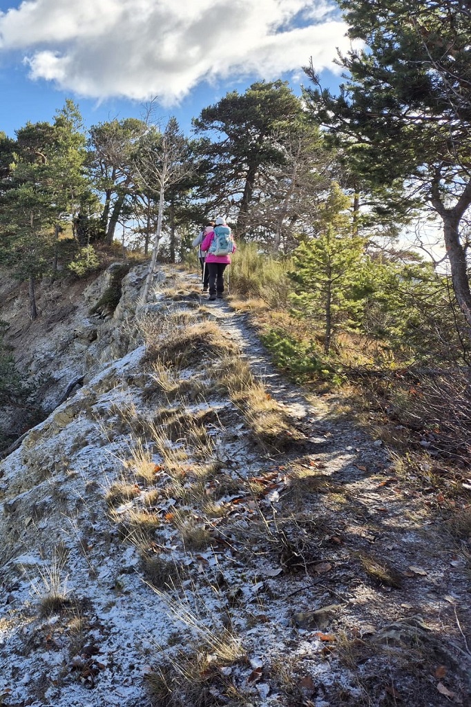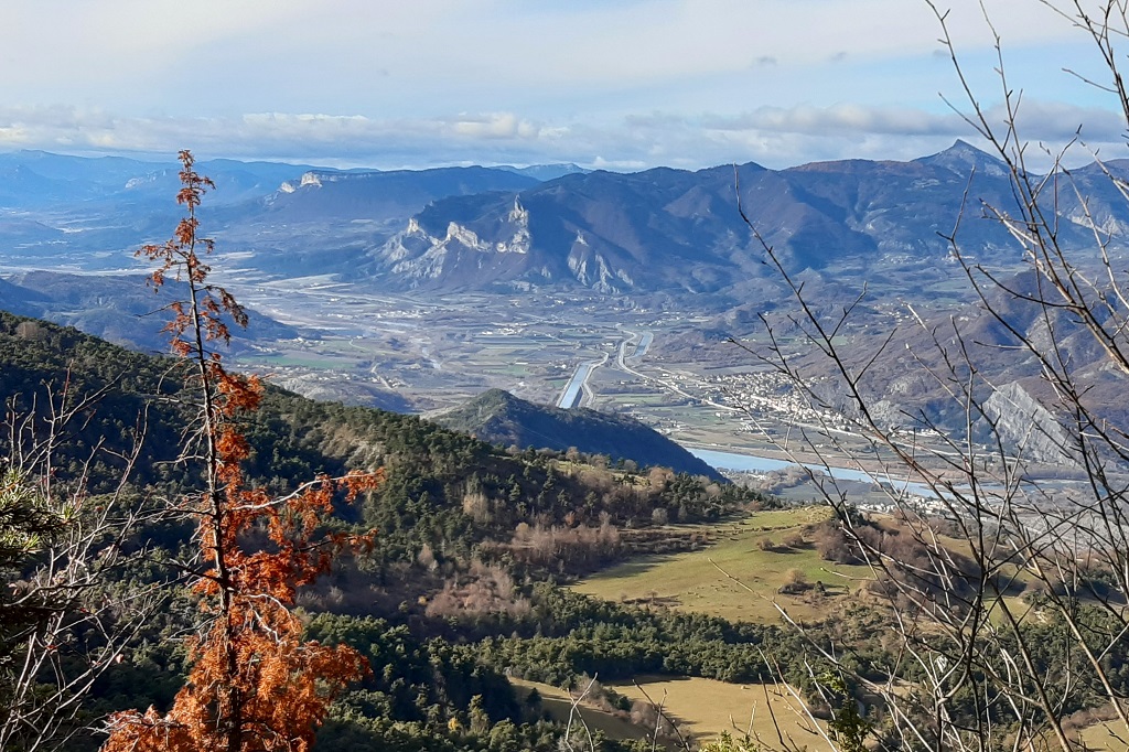 Jolie randonnée principalement en forêt. La traversée des crêtes, ponctuée de montées et descentes, raides parfois, est très agréable car elle offre de jolies points de vues sur la vallée de la Durance et les sommets enneigés du Champsaur et du Dévoluy et la Montagne de Jouère, l’Oratoire, le Pouzenc et le Blayeul, plus au Sud. Ce matin, la température était seulement de quelques degrés au-dessus de zéro et le sol était bien gelé avec quelques endroits encore couverts de givre. Nous avons pique-niqué au sommet des Pluis, sur le versant bien ensoleillé en commençant par la dégustation du Beaujolais nouveau accompagné de quiches et charcuteries diverses et pour terminer avec la brioche faite par Thierry. Marcel est venu à notre rencontre jusqu’à l’embranchement de la piste qui redescend à Venterol et a terminé la randonnée avec nous jusqu’au parking.