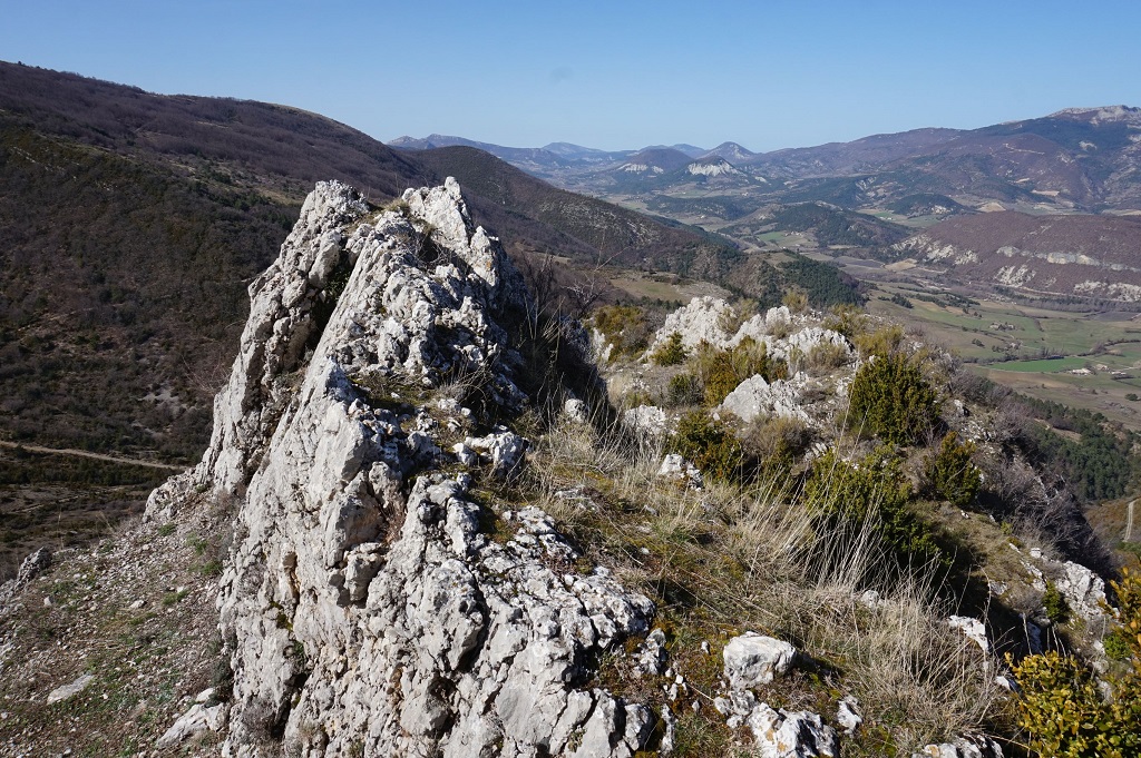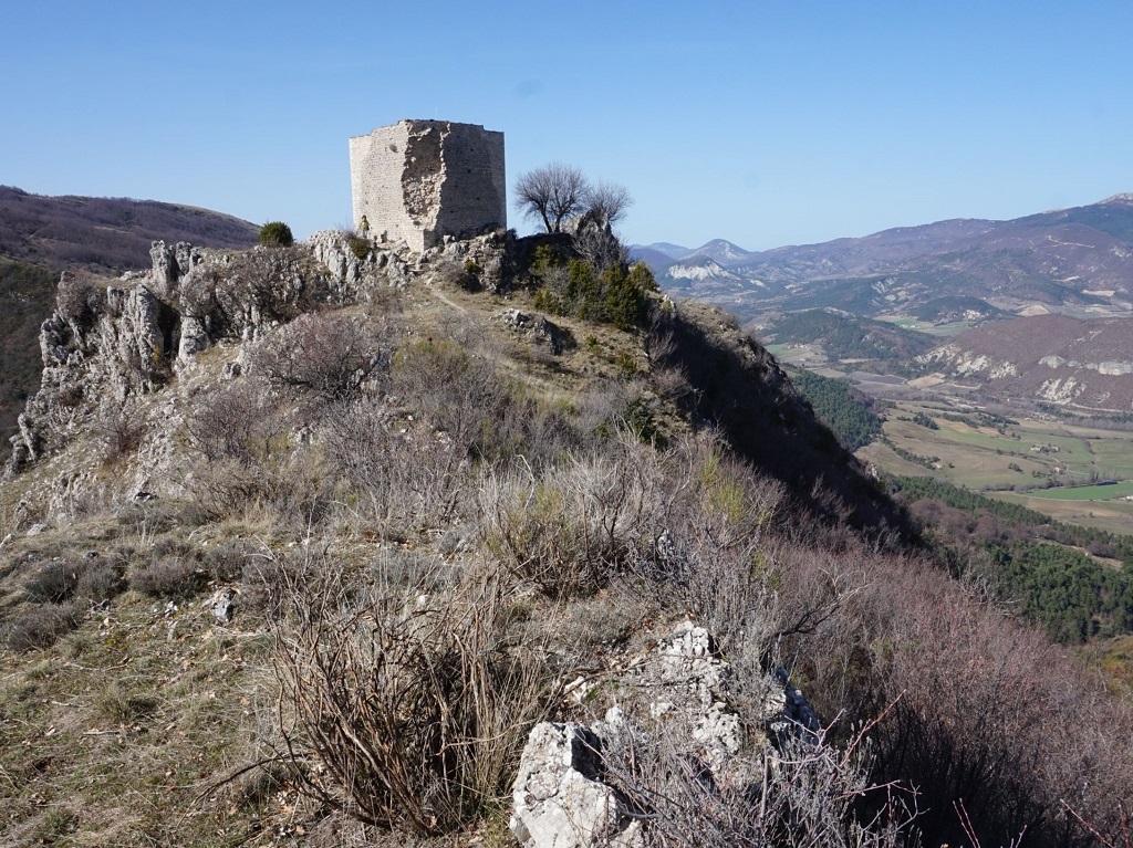 Jolie escapade dans la Drôme provençale en direction de la plus haute Tour médiévale des Baronnies, perchée à environ 1190 m d’altitude « la Tour du Riable », vestige d’un site fortifié. Autrefois entourée d’autres bâtiments, la tour semble à ce jour encore en cours de restauration (citernes et outils de maçon sont toujours sur le site). Nous pique-niquons aux pieds des rochers à proximité de la tour et nous admirons à loisir le magnifique paysage sur les villages de la haute vallée de la Méouge : Lachau, Ballons, Barret-sur-Méouge mais aussi sur la vallée de la Durance et jusqu’au massif des Ecrins, au Nord. Nous fêtons joyeusement les anniversaires d’Irène et de Patricia. Le temps est ensoleillé et très doux pour la saison. Les crocus, bulbocodes, hépatiques, primevères et violettes font leur apparition. Descente tranquille au milieu des cultures et des champs avec quelques passages un peu boueux dans la plaine, bien arrosée ces derniers temps. Avant de rejoindre le parking, nous nous arrêtons pour pénétrer à l’intérieur de la chapelle de Notre-Dame de Calma, ancienne église du prieuré de Cluny (diocèse de Gap) dont le volume spacieux (nef de 13.10 de haut) tranchant avec l’aspect sombre et massif de l’extérieur, accueille aujourd’hui des expositions et des concerts et la traditionnelle messe du 15 août.