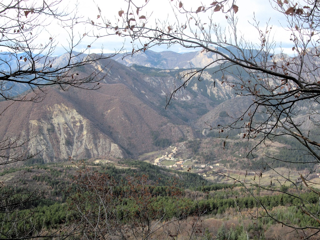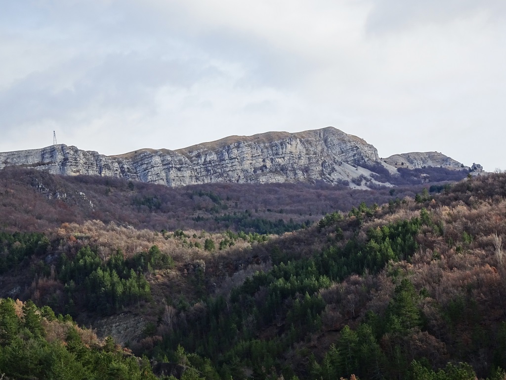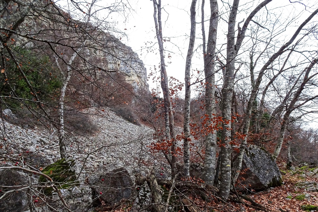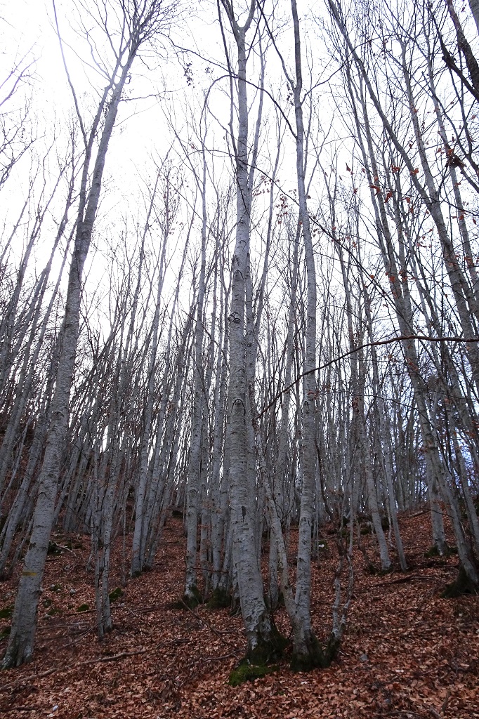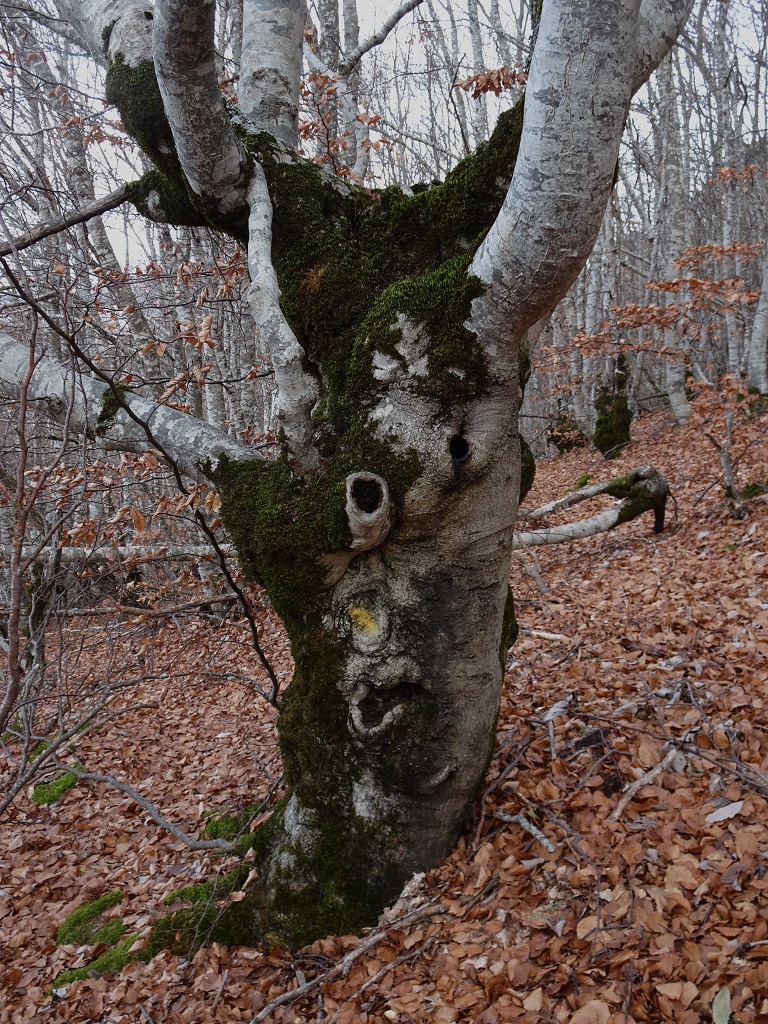 Dernière sortie de l’année. La montée versant nord-ouest est à l’ombre et la piste au départ est verglacée. Il y a un peu de givre de part et d’autre des sentiers. Il fait froid mais nous nous réchauffons vite en marchant d’un bon pas. Après avoir traversé la forêt de pins, nous voici dans la forêt de hêtres dont certains vieux spécimens aux formes noueuses et tordues attirent notre regard. Nous marchons sur un tapis de feuilles au milieu de rochers recouverts de