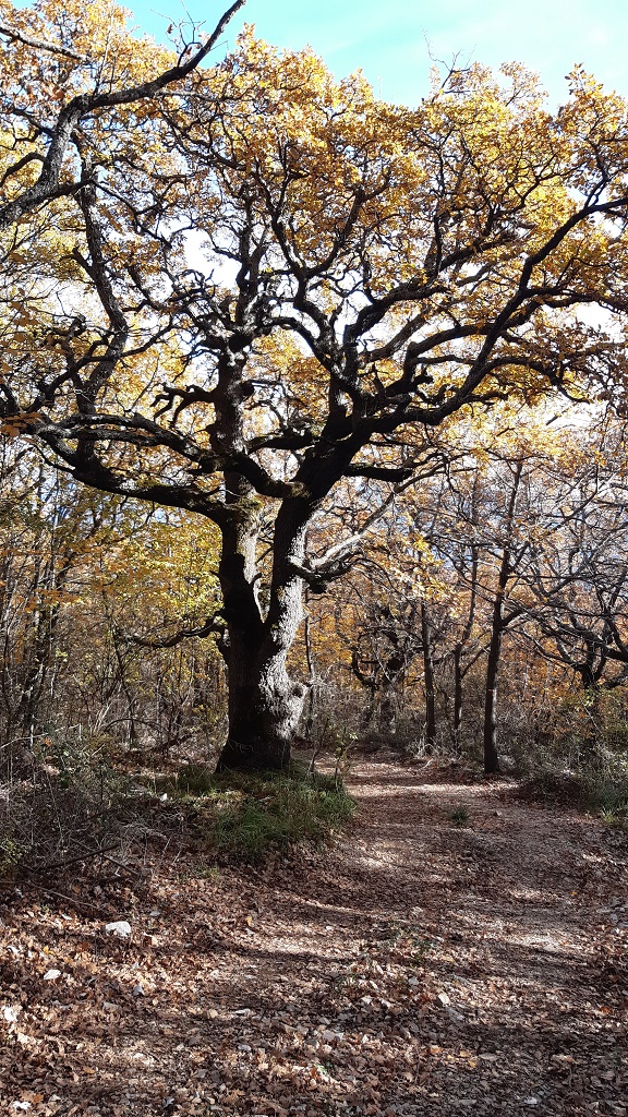 Monter la route des Granges (voie sans issus ). On se trouve rapidement au milieu des chênes sur une large piste, balisée GR, qui va nous emmener par une montée bien soutenue jusqu’au Pas de Peipin (panneau indiquant 1h45 ).
