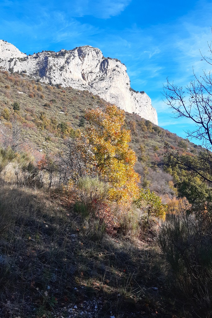 Celui-ci débute en sous bois, traverse un petit torrent et continue à grimper, d’abord sous la barre rocheuse, puis la franchit.