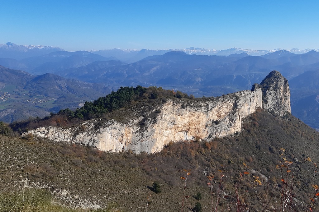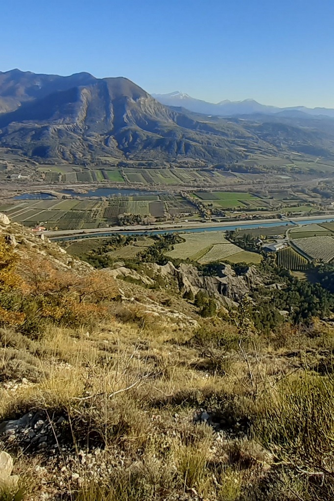 Le sentier qui monte à l’adret, domine la vallée de Durance. C’est l’ancien chemin d’accès aux hameaux de Crigne, dont on fait le tour, en partie par les pistes forestières, sans passer par le sommet du pic.